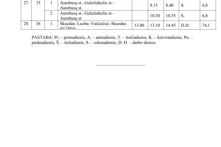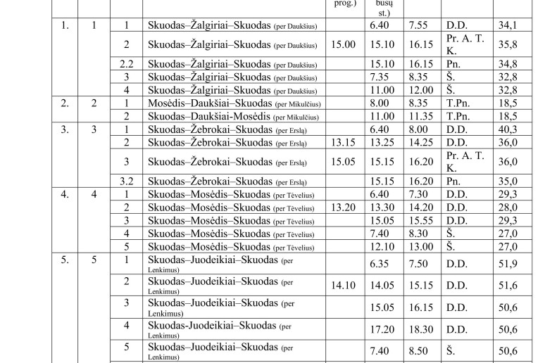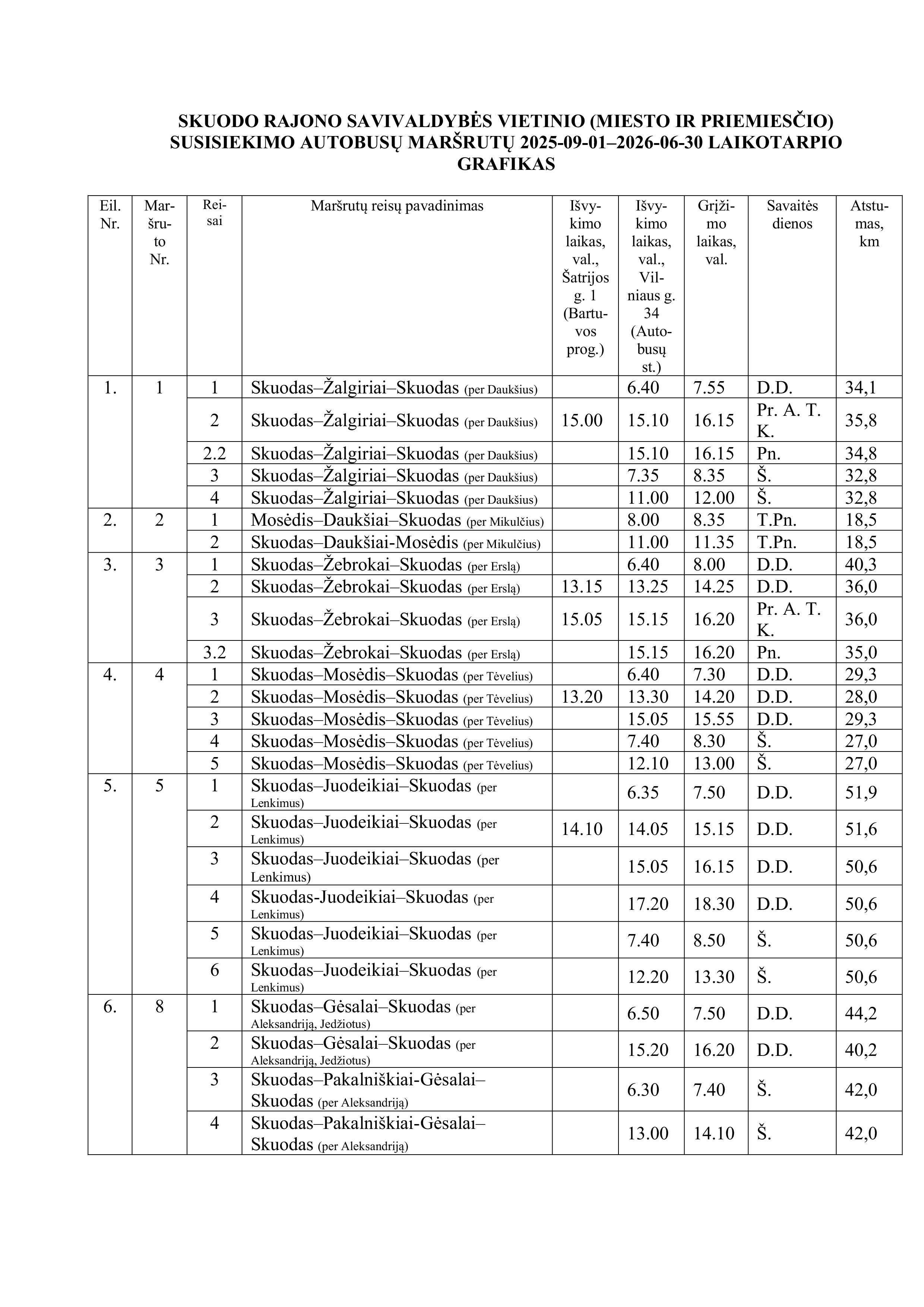 Informuojame, kad nuo 2025 m. rugsėjo 1 d. iki 2026 m. birželio 30 d. (įskaitytinai) keičiasi Skuodo rajono savivaldybės vietinio (miesto ir priemiesčio) susisiekimo autobusų maršrutų grafikas ir reisų tvarkaraščiai.